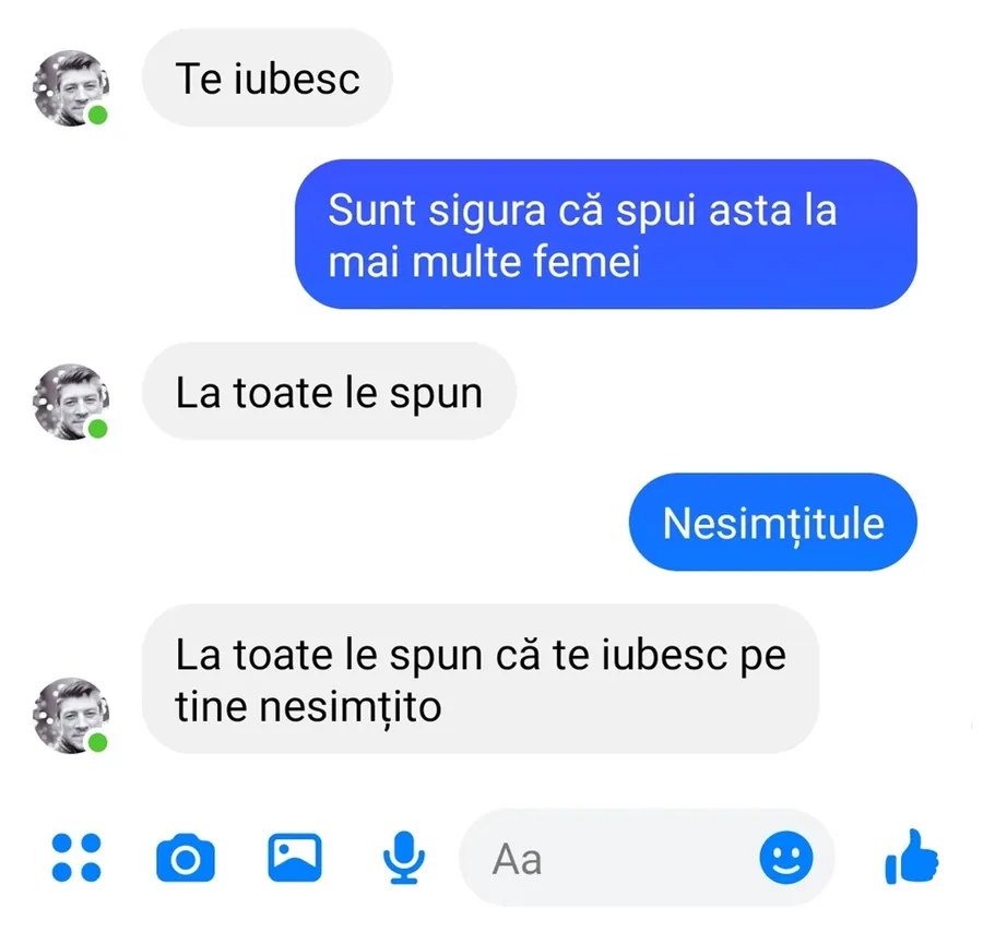 – La toate le spun că te iubesc pe tine nesimțito.