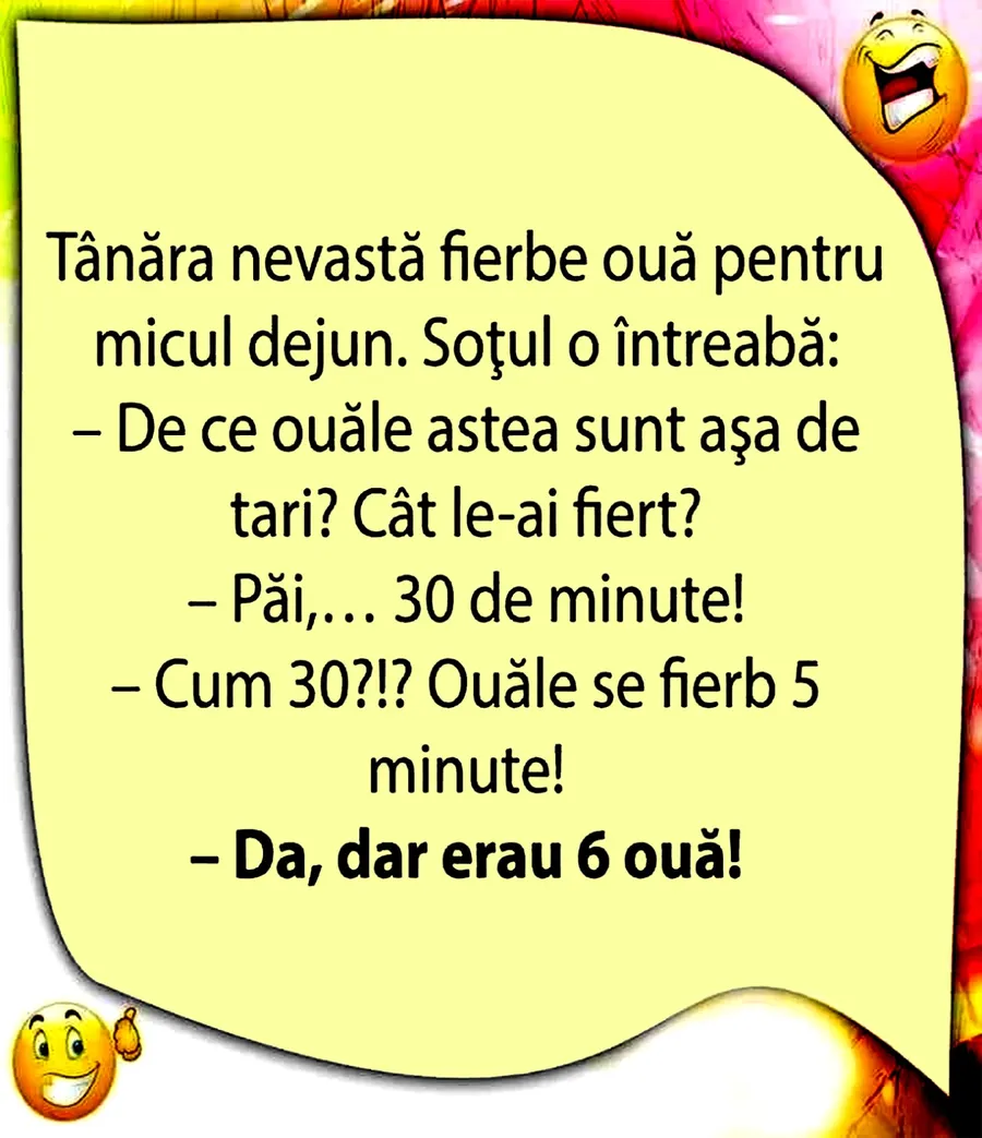 Nu trebuie să treacă nicio zi fără o porție copioasă de râs, iar pentru asta am pregătit un banc care cu siguranță o să îți aducă zâmbetul pe buze. Protagoniștii de astăzi sunt doi tineri proaspăt căsătoriți. Ea pregătește micul dejun și întâmpină o problemă atunci când vine vorba de ouăle fierte. Deznodământul este hilar.