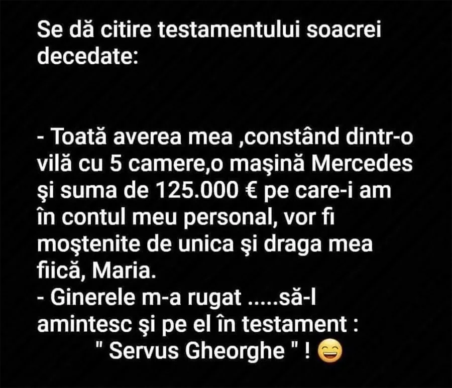 Ziua bună se cunoaște încă de dimineață, așa că trebuie începută cu zâmbetul pe buze. Iar peste asta am pregătit un banc care cu siguranță te va amuza copios. Protagonistul de astăzi este un bărbat care speră că o să se regăsească și el în testamentul lăsat de soacra sa. Deznodământul este hilar.