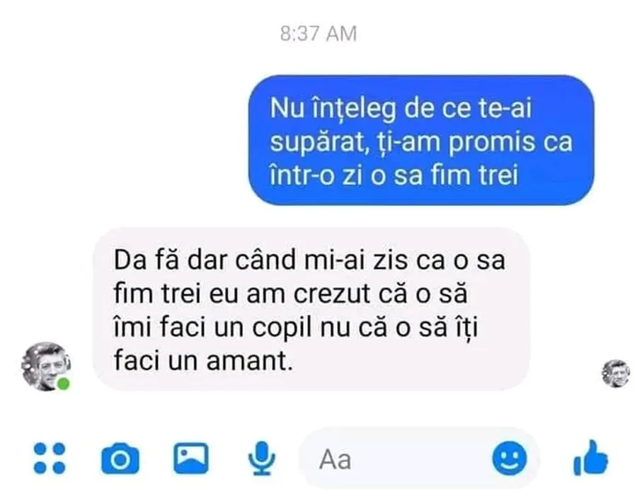 „ – Nu înțeleg de ce te-ai supărat, ți-am promis că într-o zi o să fim trei.