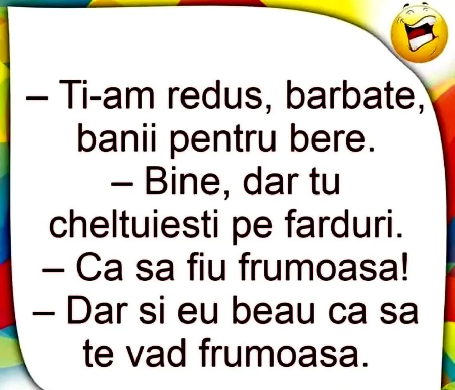 Dragi cititori, CANCAN.RO vă prezintă bancul zilei, acesta fiind o conversație între doi soți. În timp ce el își dorește să cumpere bere, ea visează la farduri. Totuși, replica finală este de-a dreptul genială. Spor la citit!