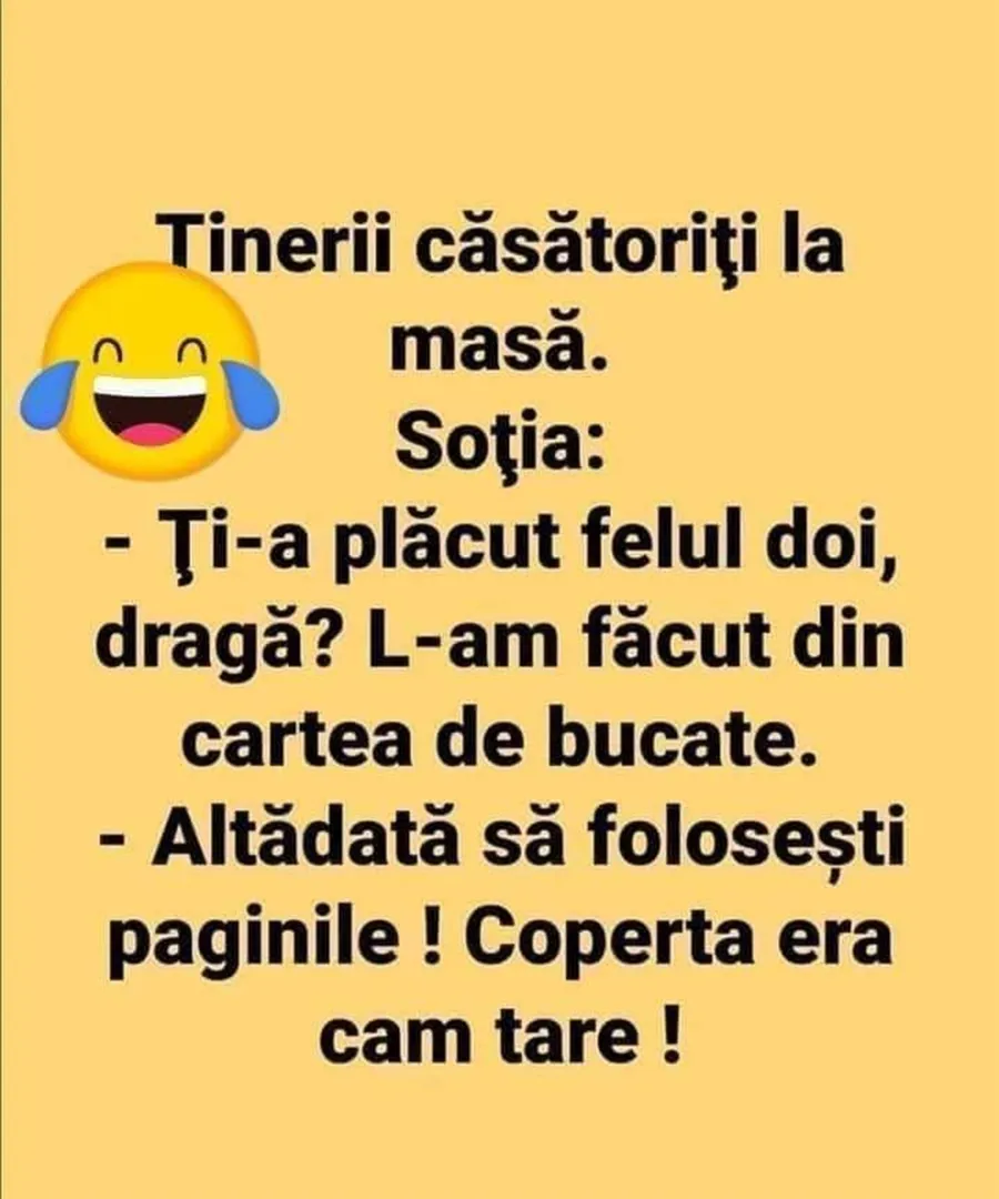 Ziua bună se cunoaște încă de dimineață, așa că trebuie începută cu zâmbetul pe buze. Este luni și dăm startul unei noi săptămâni pline de voie bună. Pentru astăzi am pregătit un banc care cu siguranță o să te amuze copios. Protagoniștii sunt doi tineri căsătoriți, care servesc masa împreună. Soția și-a dat toată silința atunci când a gătit, iar deznodământul este hilar.