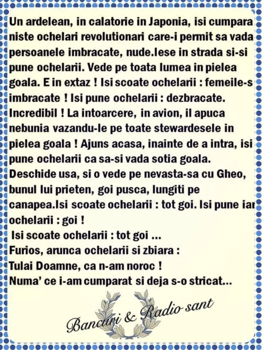 „Un ardelean, în călătorie în Japonia, își cumpără niște ochelari revoluționari care-i permit să vadă persoanele îmbrăcate, nude. Iese în stradă și își pune ochelarii. Vede pe toată lumea în pielea goală. E în extaz! Își scoate ochelarii: femeile-s îmbrăcate! Își pune ochelarii: dezbrăcate. Incredibil!