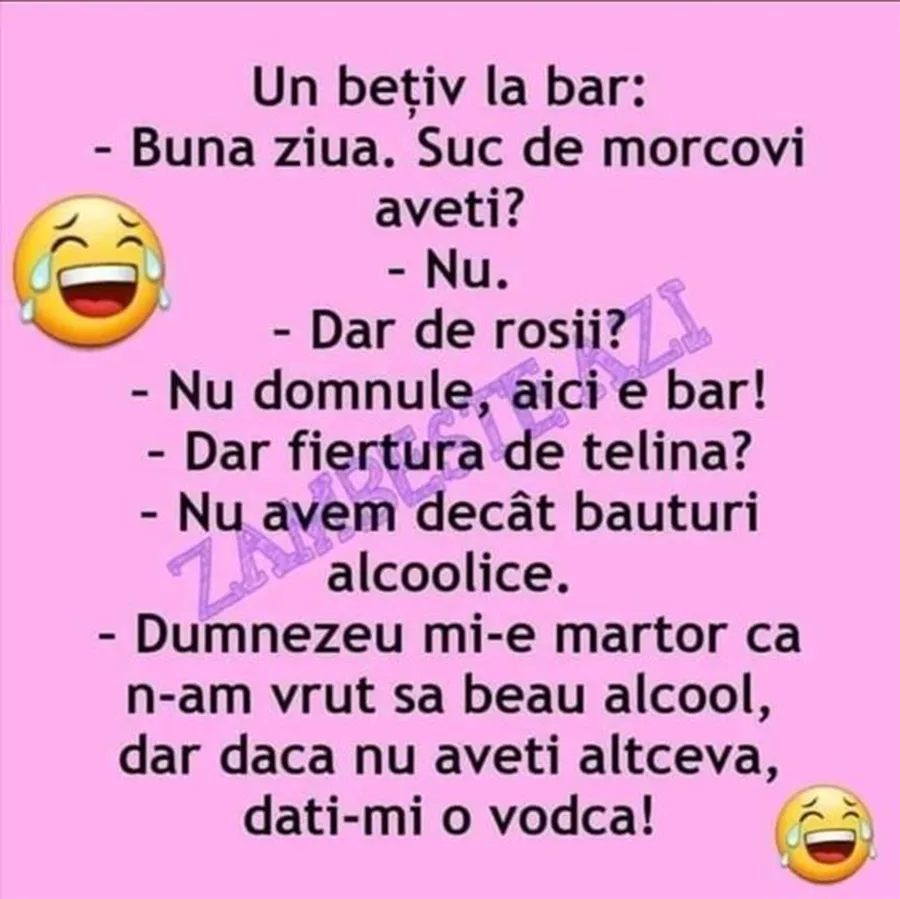 BANCUL ZILEI | Un bețiv, la bar: „Suc de morcovi aveți?”