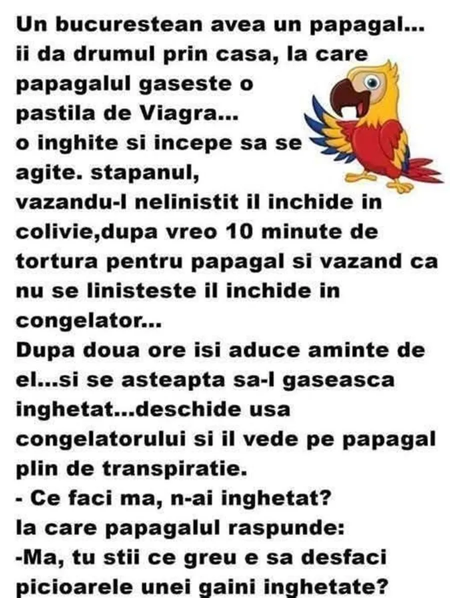 Un bucureștean avea un papagal. Îi dă drumul prin casă, iar papagalul găsește o pastilă de Viagra.