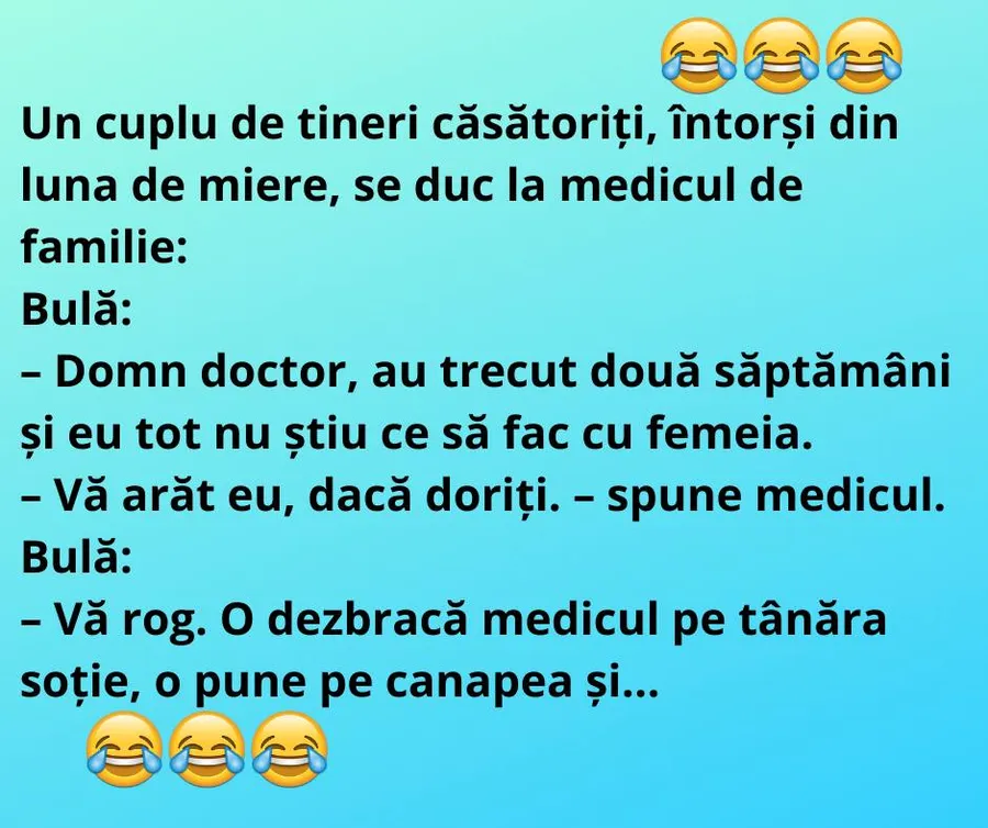 Bancul zilei. Un cuplu decide să meargă la doctorul de familie, după luna de miere. Dialogul între Bulă, soțul femeii, și medic va stârni amuzamentul. Spor la râs!