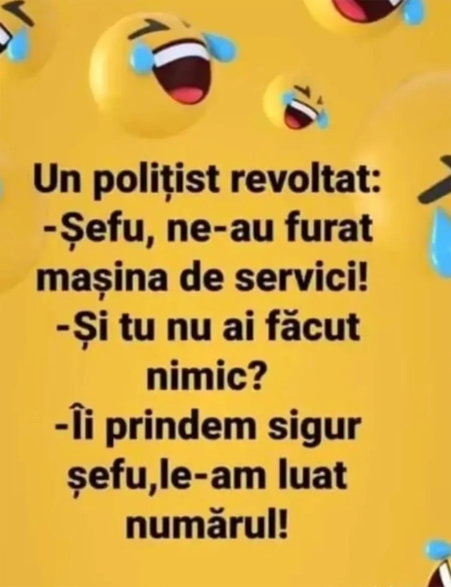 Ca să mai uiți de probleme, griji și stres, azi avem pentru tine un banc cu polițiști! Da, știm cu toții ce părere au românii despre oamenii legii și unele cazuri par să o îndreptățească. Așa este și cu omul nostru, care rămâne fără mașina din dotare! Bancul de mai jos e caterincă mare, sigur îl veți savura!