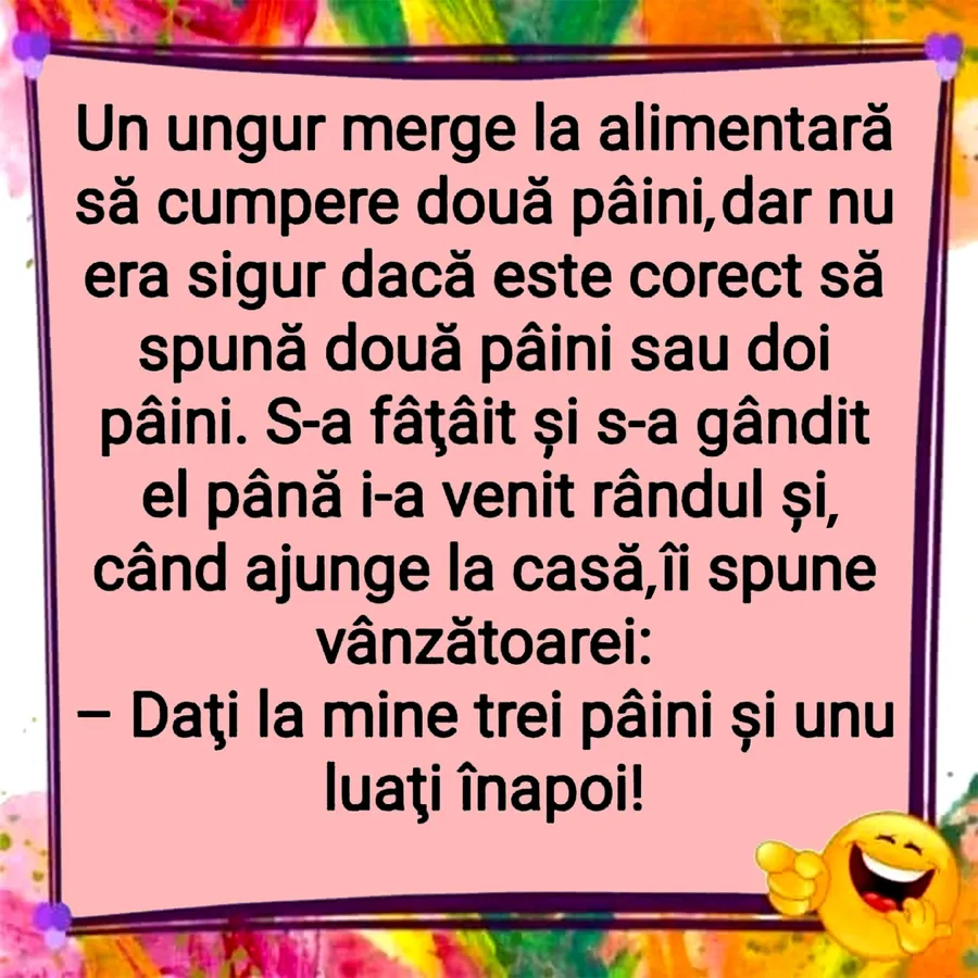Un ungur merge la alimentară să cumpere două pâini, dar nu era sigur dacă este corect să spună „două pâini” sau „doi pâini”. S-a fâțâit și s-a gândit el până i-a venit rândul și, când ajune la casă, îi spune vânzătoarei: