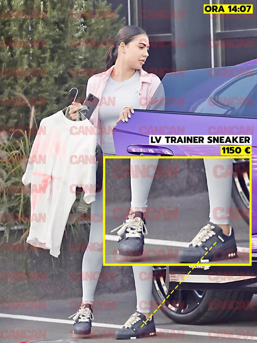 Vanessa, care stă vreo 10 secunde în mașină înainte să coboare, probabil ca să-și facă curaj să tragă de fiare, e încălțată cu o pereche de Trainer Sneakers tot de la Louis Vuitton, 1.150 euro, asortați perfect cu ținuta ei de fitness, cu colanți gri și un top de aceeași culoare uni mată.