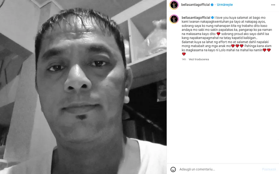 Sunt atât de mândră de tine pentru că ai fost un tată, frate, prieten foarte iubitor. Îți mulțumesc, frate, pentru toate eforturile tale și îți mulțumesc că ți-ai crescut copiii să fie buni. Odihnește-te în pace! Știu că tu și Lolo sunteți împreună, vă iubim atât de mult.”, a scris Bella Santiago pe Instagram.