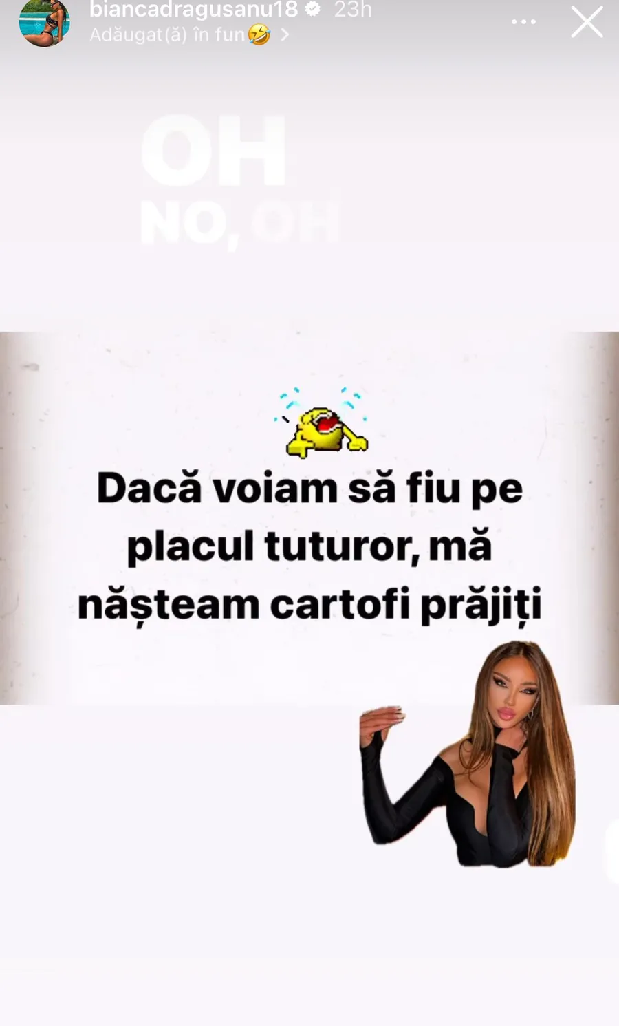 „Dacă voiam să fiu pe placul tuturor, mă nășteam cartofi prăjiți”, este mesajul postat de Bianca Drăgușanu la InstaStory.