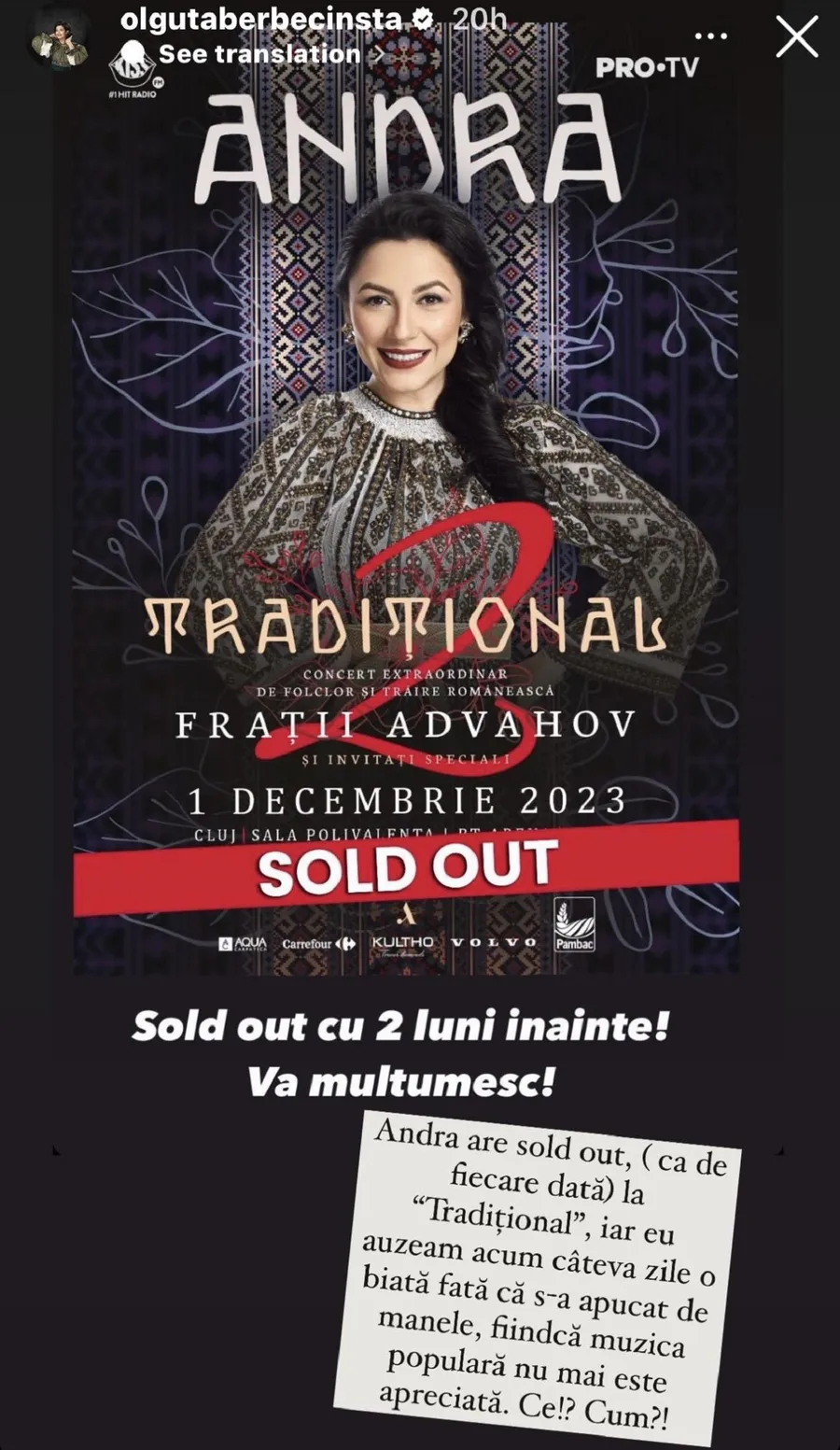 ”Andra are sold out, (ca de fiecare dată) la „Tradițional”, iar eu auzeam acum câteva zile o biată fată că s-a apucat de manele, fiindcă muzica populară nu mai este apreciată. Ce?! Cum?!”, este mesajul postat de Olguța Berbec pe contul ei personal de Instagram.