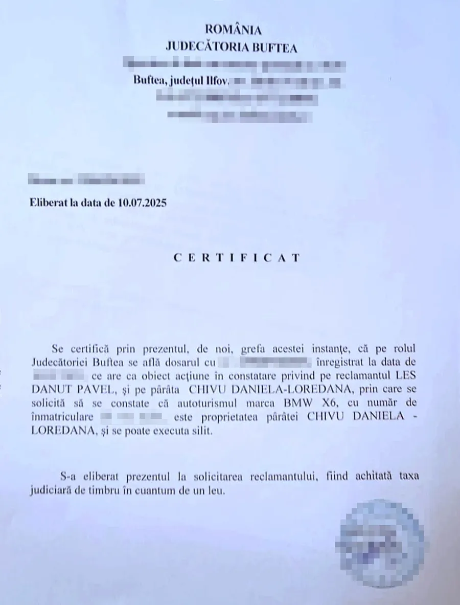 Numai că, se pare, problema nu-i deloc rezolvată! Asta pentru că pe rolul Judecătoriei Buftea a fost înregistrat un dosar, în care se solicită să se constate că autoturismul este proprietatea Loredanei Chivu! Iar dacă se va dovedi asta, atunci mașina poate fi executată silit!