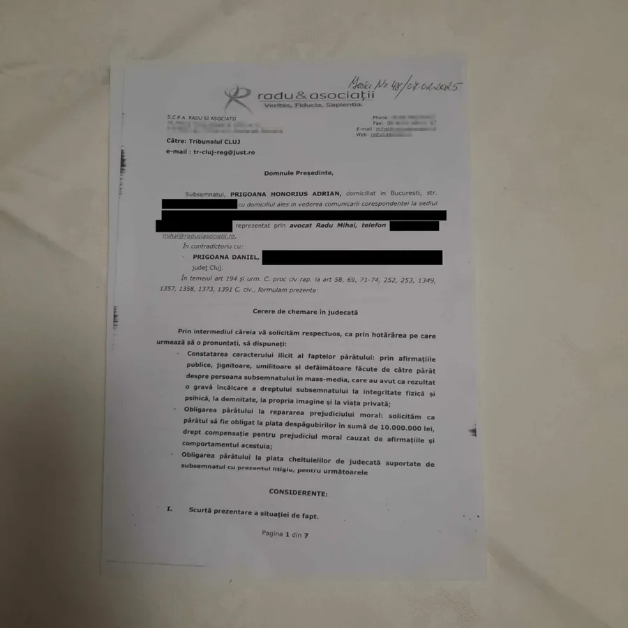 În documentul oficial depus la tribunal, Honorius Prigoană solicită:
