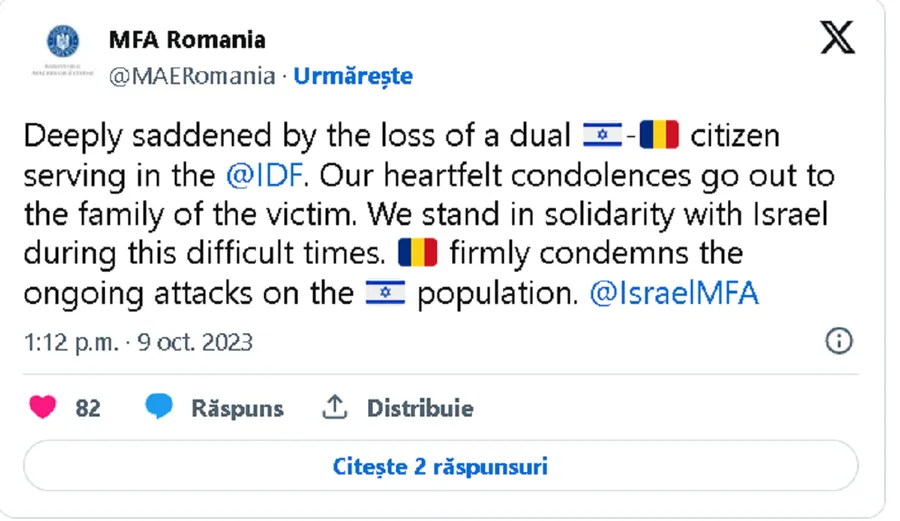 „Profund întristați de pierderea unui cetățean cu dublă cetățenie care deservește în armata israeliană. Sincere condoleanțe familiei victimei. Suntem solidari cu Israelul în aceste vremuri dificile. România condamnă ferm atacurile în curs asupra populației Israelului”, a transmis MAE.