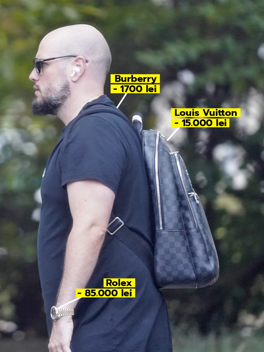 Totuși, și-a pus la mână un ceas Rolex “Chocolate Dial”, în valoare de 85.000 lei și și-a tras în spate un ghiozdan Louis Vuitton, care costă nu mai puțin de 15.000 lei. Cu așa accesorii, vloggerul a decis să nu epateze într-atât, așa că a ales un tricou negru… dar de brand. Burberry.