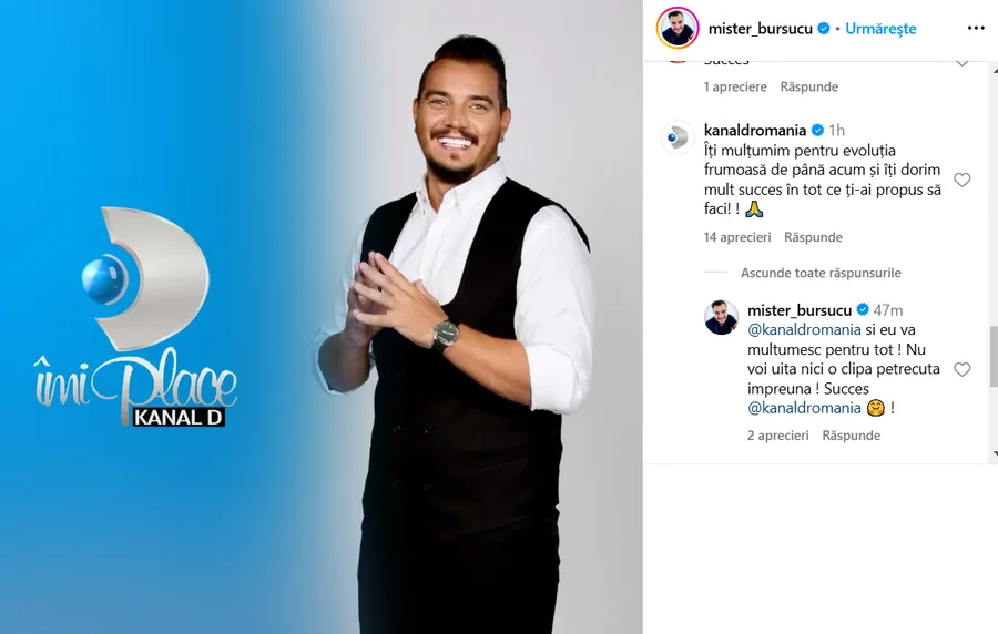 Dar știți cum e viața – uneori trebuie să închizi un capitol… pentru a se deschide altul NOU! Așa că vă mulțumesc din suflet vouă, telespectatorilor, că ați râs, ați plâns și ați fost mereu cu mine. Povestea continuă… doar că pe alte scene, alte formate, alte emoții, pregătit pentru o nouă aventură și gata să fac SHOW oriunde merg!”, a scris Bursucu pe Instagram.