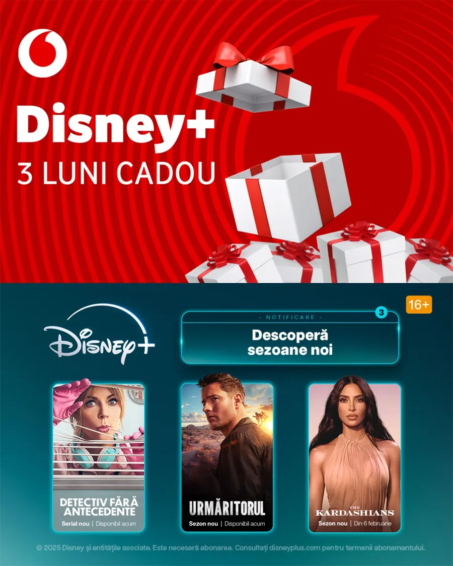 ”Exclusiv la Vodafone, Disney + vine cu un și mai mare plus: ai cadou primele 3 luni în care te poți uita la oricâte seriale și filme vrei, de pe orice dispozitiv, de oriunde”, se arată în anunțul Vodafone.