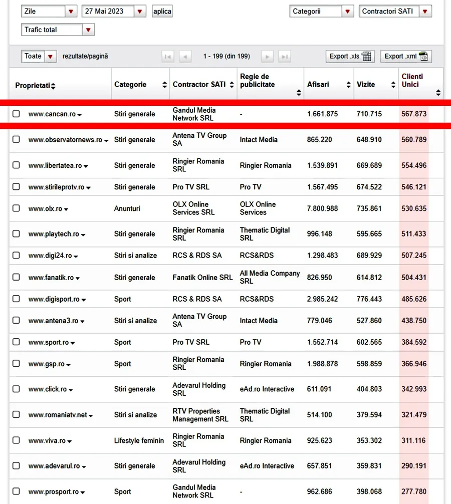 Sâmbătă, 27 mai 2023, CANCAN.RO a fost cel mai accesat site din România. Potrivit datelor furnizate de SATI (Studiul de Audiență şi Trafic Internet) din cadrul Biroului Român de Audit Transmedia (BRAT), CANCAN a fost liderul clasamentului național la capitolul „clienți unici”.