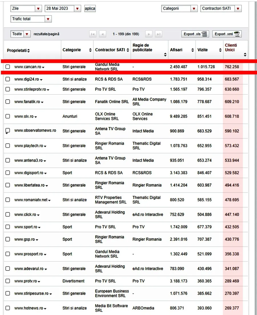 CANCAN.RO a adunat un număr de 762.258 de clienți unici în data de 28 mai 2023, în vreme ce digi24.ro a contabilizat un total de 683.567 de clienți unici în același interval.
