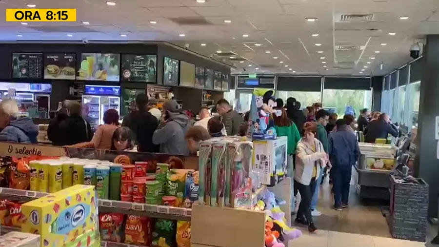 ORA 08:15: La prima benzinărie de pe Autostrada Soarelui (Kilometrul 48), românii stau la coadă pentru o cafea sau un sandwich.
