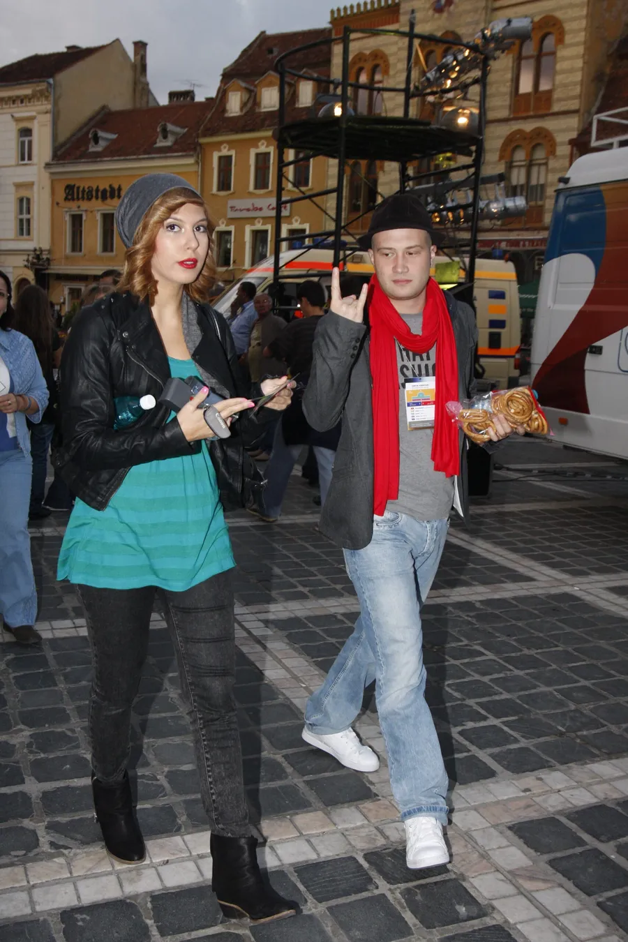 Lângă el, Sore pare venită din alt film. Una grunge, una Nirvana, una „sora pierdută a lui Kurt Cobain”. Are o căciulă trasă pe cap de parcă se teme de curent, o geacă de piele de motociclist, o bluză sau fustă care nu e clar ce vrea să fie, blugi gri și cizme negre. Totul e perfect, până la zuluful acela roșcat, ondulat, care pare scos dintr-o perucă de teatru de provincie. Dacă n-ar fi lângă Bendeac, poate ar părea cool. Dar lângă el, contrastul devine comic: ea e prea rock, el direct contabil rebel. Și undeva între ei plutește întrebarea: „Cum s-au găsit ăștia doi?”