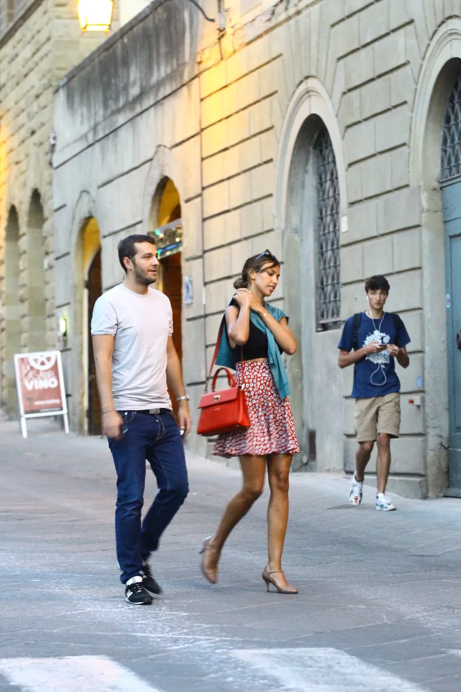 Geanta roșie Hermes — normal, în universul acesta nu există o geantă, există un statement. Și pantofi cu toc scurt, tot vintage, ca o declarație subtilă că nu are nevoie de 12 centimetri ca să fie văzută. În tot ansamblul, era genul de apariție pe care scrie Italia , chiar dacă ea, la momentul ăla, încă își spunea că e doar o plimbare în oraș. Nu era doar modă, era atmosferă.