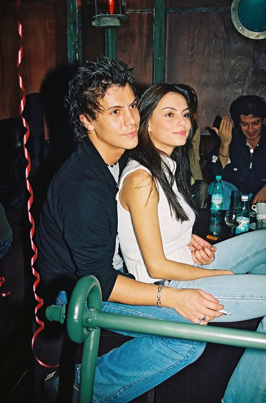 Barul era bar pe atunci! Se fuma, era fum, muzică tare, alcool. Cum trebuie, nu ca azi pe vremurile astea corect politic. Plecai de îți miroseau hainele de zici că băgasei cărbuni la grătar la mici la Obor. Răzvan fuma și el ca un rocker, viitor actor de telenovele. El pe scaun, ea? Pe el. Erau anii în care iubirea se manifesta Domnule peste tot! Nu îți era rușine să te ții de mână, să ții o fată în poală. Se țineau și de mână. Probabil era bar cu muzică live căci ambii par a privi spre scenă. Frumoși de să-i pici cu ceară. Latino lovers!