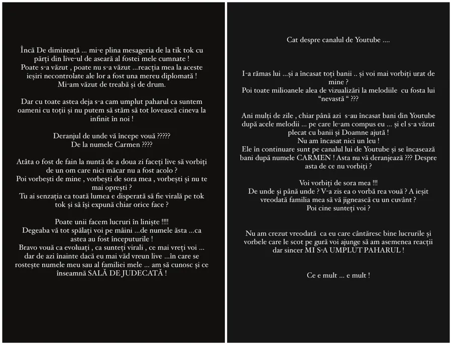 „Încă de dimineață… mi-e plină mesageria de la tik tok cu părți din live-ul de aseară al fostei mele cumnate! Poate s-a văzut, poate nu s-a văzut …reacția mea la aceste ieșiri necontrolate ale lor a fost una mereu diplomată! Mereu mi-am văzut de treabă și de drum. Dar cu toate astea deja s-a cam umplut paharul că suntem oameni cu toții și nu putem să stăm să tot lovească cineva la infinit în noi! Deranjul de unde vă începe vouă ????? De la numele Carmen ???? Atâta o fost de fain la nuntă de a doua zi faceți live să vorbiți de un om care nici măcar nu a fost acolo?