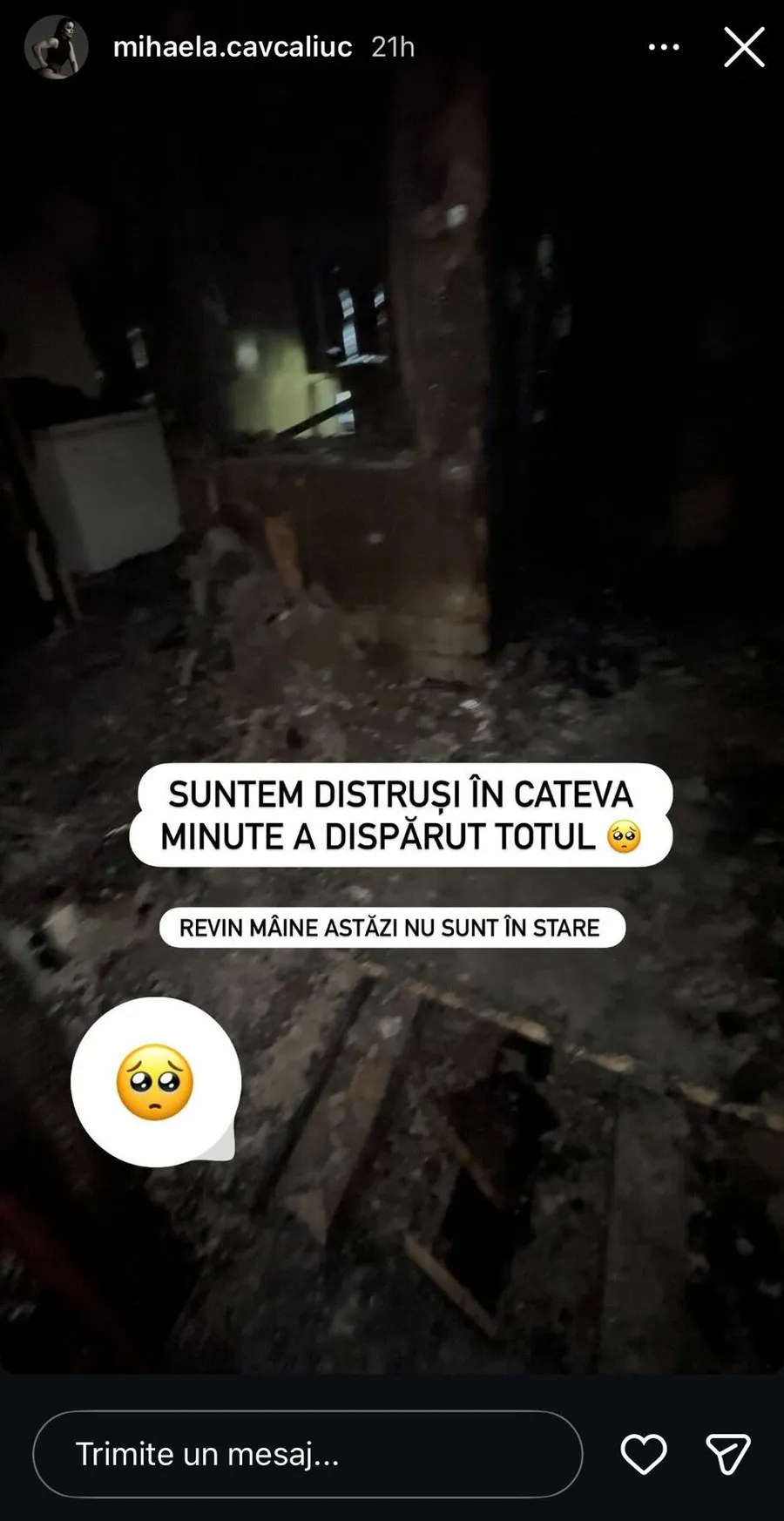 „Suntem distruși. În câteva minute, a dispărut totul. Revin mâine, astăzi nu sunt în stare. Mâine vă povestim. Mulțumim lui Dumnezeu că suntem toți în viață”, a scris aceasta, pe Instagram.