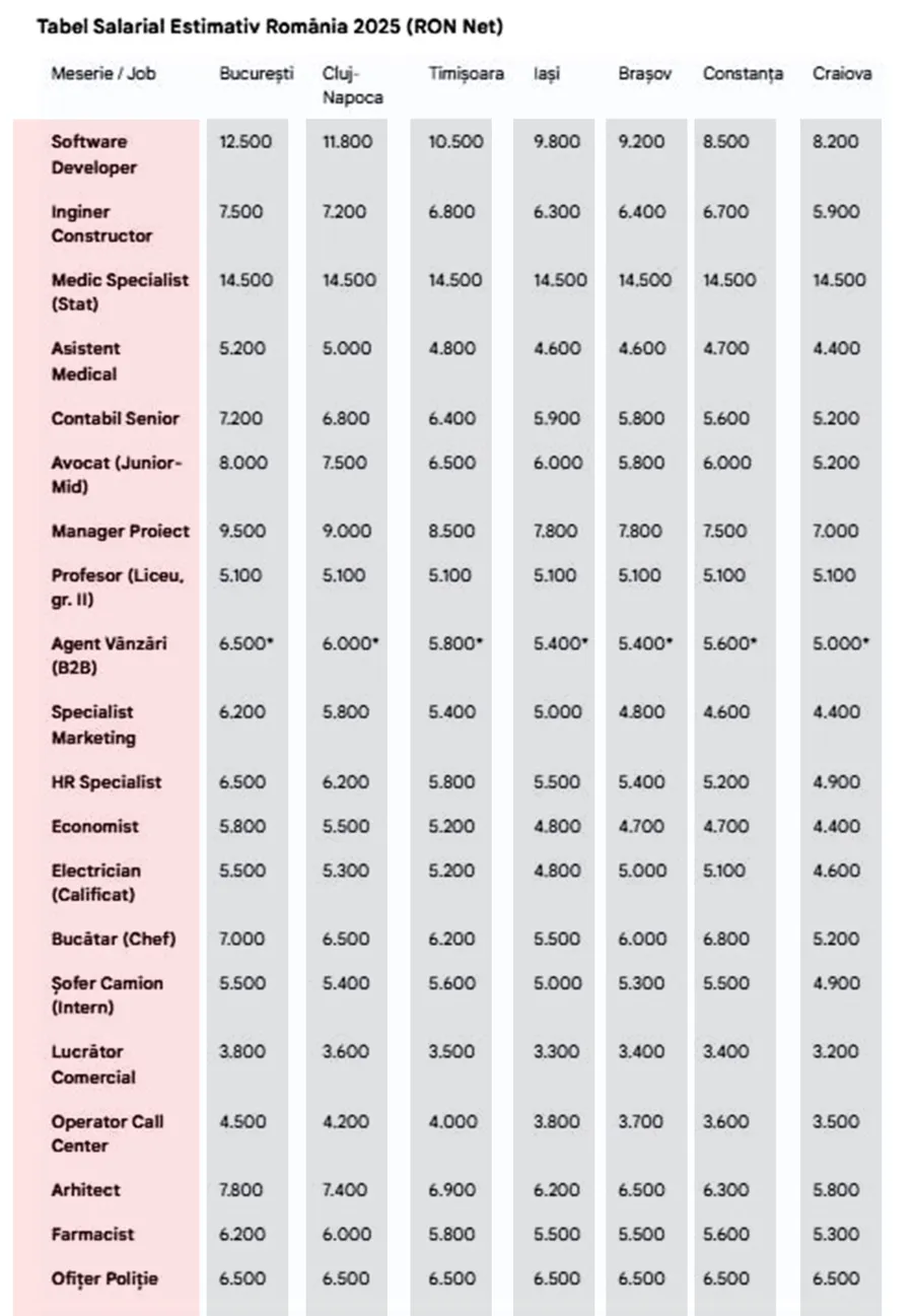 Tabelul salarial estimativ arată cât ar trebui să câștigi „în mână” pentru 20 dintre cele mai populare joburi din România, comparate în cele mai mari 7 orașe. Diferențele sunt de mii de lei, iar dacă nu știi cât valorezi, riști să rămâi blocat cu un salariu sub media pieței.
