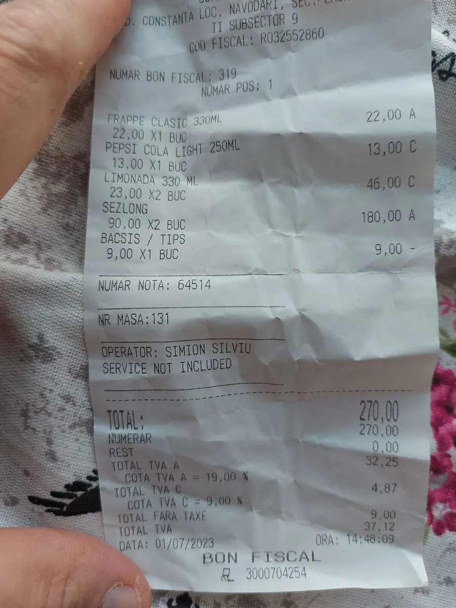 „O ieșire la plaja de câteva ore, ieri. Atașez bonul… Menționez că la Scala Marion, la 10, e consumație obligatorie de sezlong, am mai primit gratuit chips-uri și 2 sticle de apă la 0,5… Aici, am primit doar bonul fiscal…”, și-a încheiat turistul postarea.