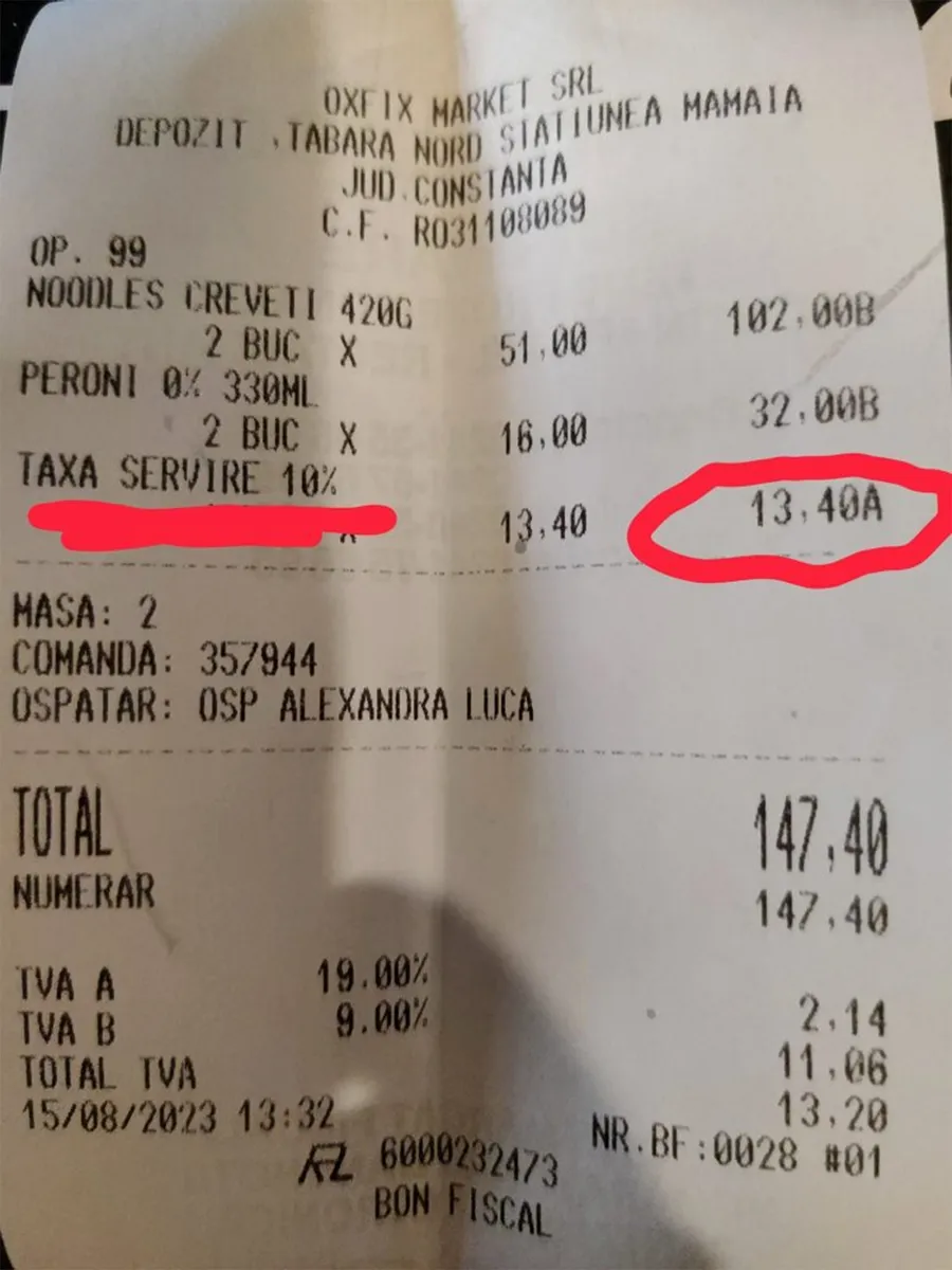 Pentru o notă de 134 de lei, clientul a avut de achitat încă 13,40 de lei ca „taxă de servire”, un fel de bacșiș obligatoriu pentru faptul că un angajat i-a adus la masă două bere și două porții de noodles cu creveți.