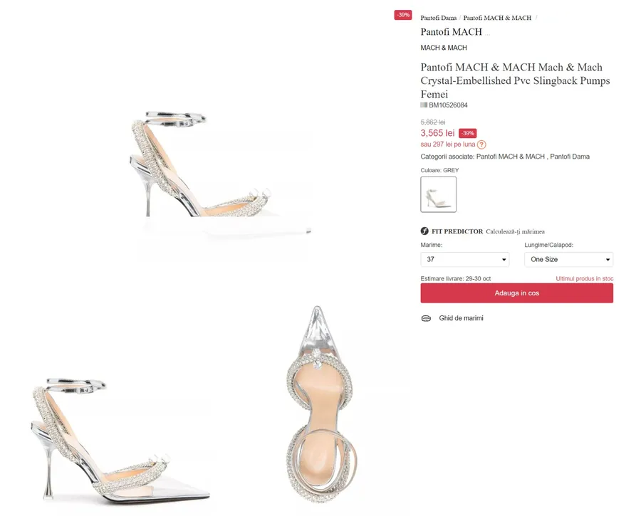 Ei bine, mulți au fost curioși să afle cât a dat Larisa Udilă pe pantofii de mireasă și putem spune că prețul nu este unul neglijabil. Acum, aceștia beneficiază de o reducere de 39% și costă 3.565 de lei. Însă, prețul integral al acestora este de aproape 6.000 de lei. Mai exact, tânăra a scos din buzunar 5.862 de lei.