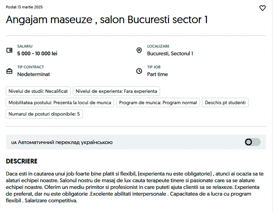 „Dacă ești în căutarea unui job foarte bine plătit și flexibil, (experiența nu este obligatorie), atunci ai ocazia să te alături echipei noastre. Salonul nostru de masaj de lux caută terapeute tinere și pasionate care să se alăture echipei noastre. Oferim un mediu primitor și profesionist în care puteți ajuta clienții să se relaxeze. Experiență de preferat, dar nu este obligatorie. Excelente abilități interpersonale. Capacitatea de a lucra cu program flexibil. Salarizare competitivă”, se arată în anunțul făcut pe OLX.