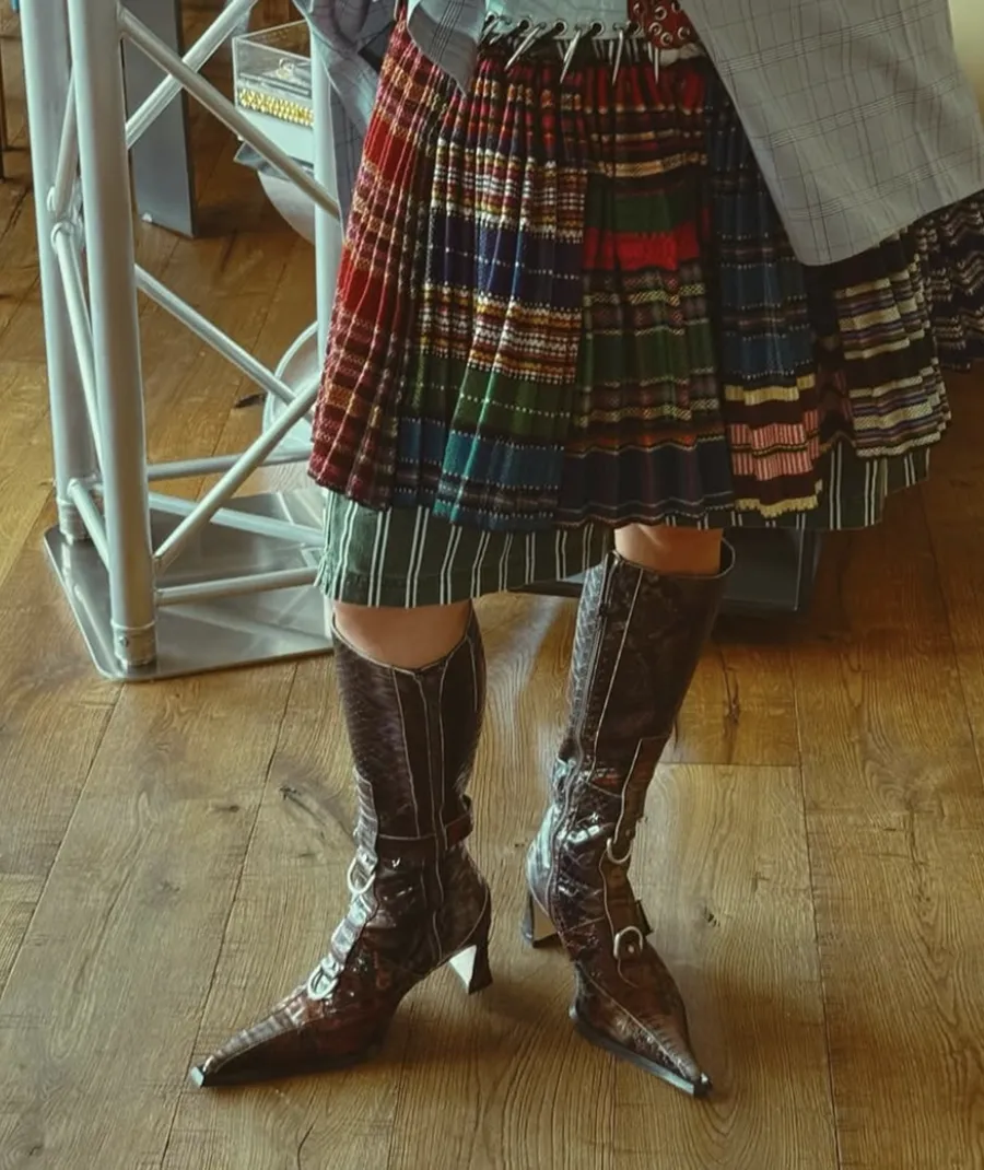Artista, obișnuită să surprindă publicul cu alegeri vestimentare inedite, și-a prezentat noua achiziție într-o postare pe Instagram, acolo unde imaginile au devenit rapid virale. Cizmele, evaluate la aproximativ 3.600 de lei, nu sunt un model obișnuit. Confectionate din piele maro, cu un finisaj ce imită textura pielii de șarpe, acestea se remarcă printr-un toc gros ușor înclinat, un vârf alungit cu formă pătrată și detalii rafinate care le diferențiază de modelele comune.