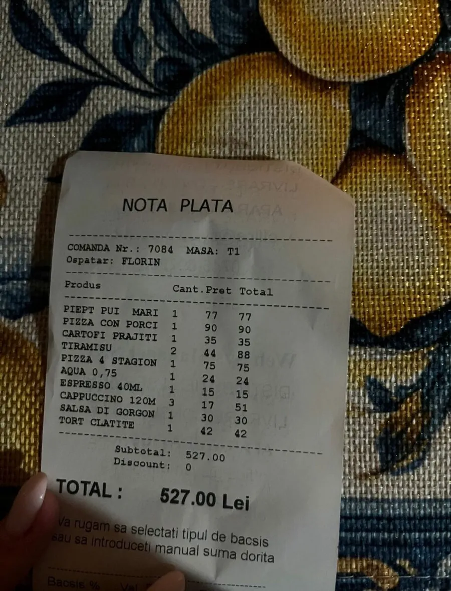 În final, nota de plată pentru masă a ajuns la 527 de lei.