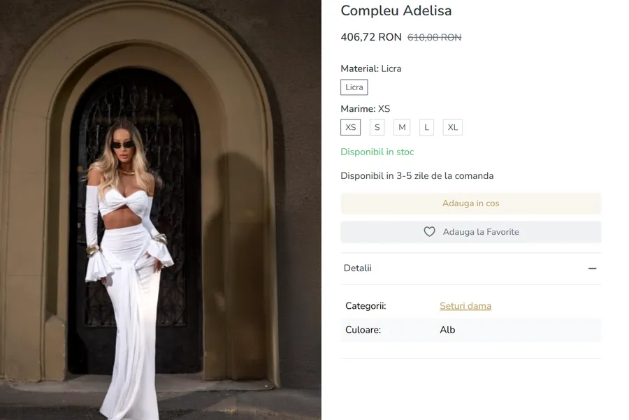 „Un outfit impecabil, destinat femeii moderne care iubește eleganța minimalistă, dar de impact. Acest set compus din top bustieră cu mâneci lungi detașabile și fustă lungă cu talie înaltă și drapaj lateral este alegerea ideală pentru evenimente speciale, petreceri de vară sau apariții pe litoral”, se arată pe site-ul oficial, unde apare compleul.