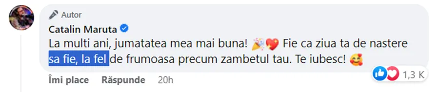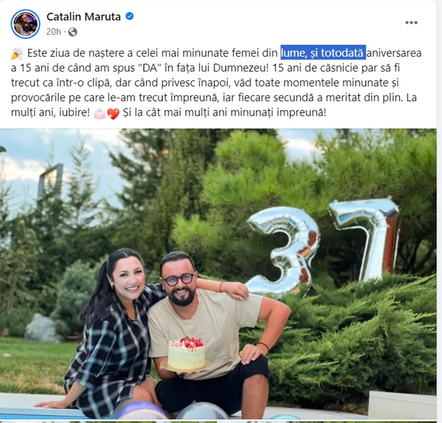 „Este ziua de naștere a cele mai minunate femei din lume, și totodată aniversarea a 15 ani de când am spus „DA” în fața lui Dumnezeu! 15 ani de căsnicie par să fi trecut ca într-o clipă, dar când privesc înapoi, văd toate momentele minunate și provocările pe care le-am trecut împreună, iar fiecare secundă a meritat din plin. La mulți ani, iubire! Și la cât mai mulți ani minunați împreună!”, este mesajul notat de Cătălin Măruță, pe Facebook. Mesajul aniversar, însă, ascunde o mică greșeală. În contextul acesta, poziția virgulei se află înainte de „și”.