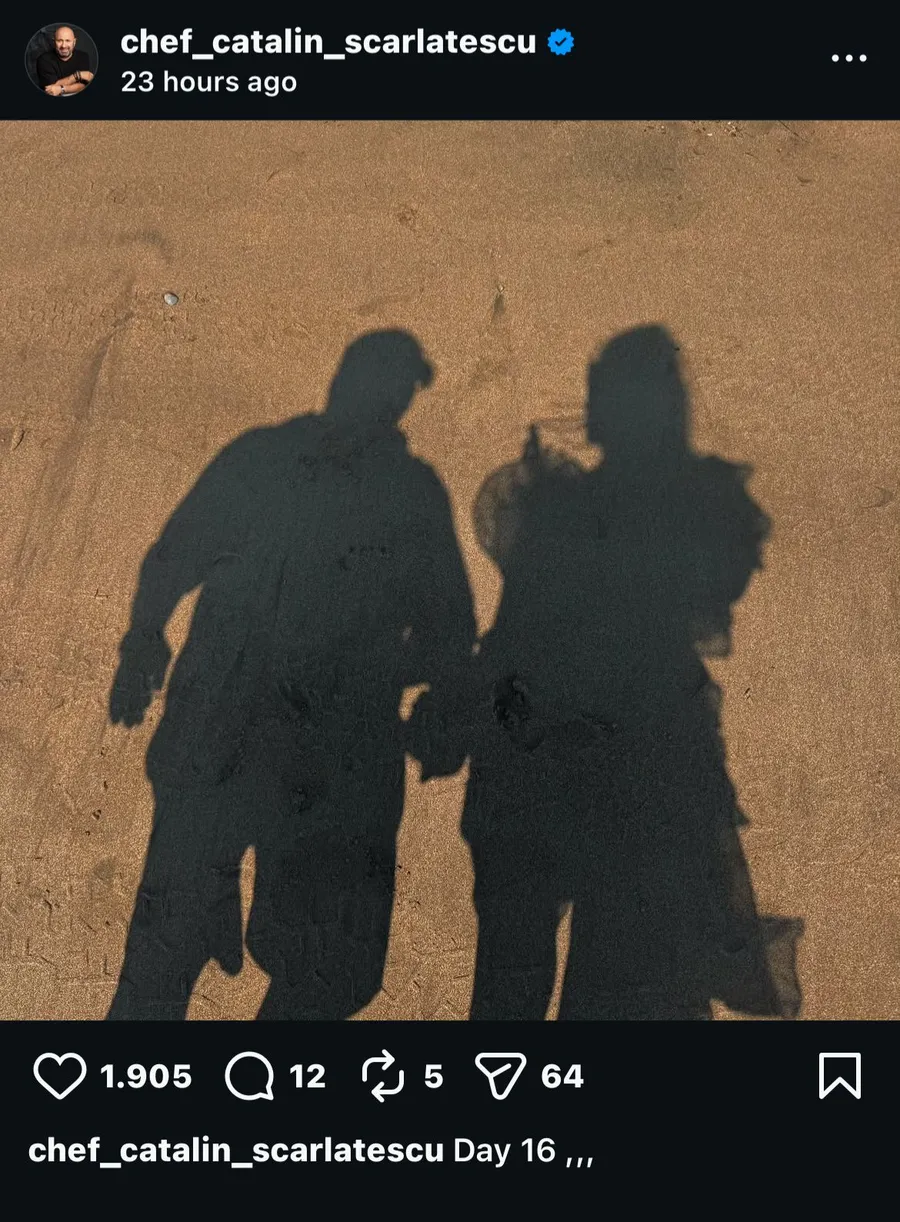 Timp de două saptămâni, Scărlătescu și Elena Gogean, o tânără arhitectă, s-au deconectat de tot, s-au relaxat și au uitat de grijile din România. Recent, juratul de la MasterChef a publicat prima fotografie alături de iubita lui. Discret, însă nu suficient cât să nu se mândrească, Scărlătescu și-a îndemnat urmăritorii să își pună imaginația la treabă și le-a prezentat o imagine cu umbra lui și a Elenei.