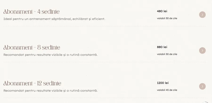 Pentru cei care preferă o metodă mai independentă, poți opta pentru o ședință este de 150 de lei, o opțiune mai accesibilă, ideală pentru cei care deja au cunoștințe de bază. Pentru a stimula frecvența regulată a antrenamentelor, studioul oferă și mai multe tipuri de abonamente lunare.