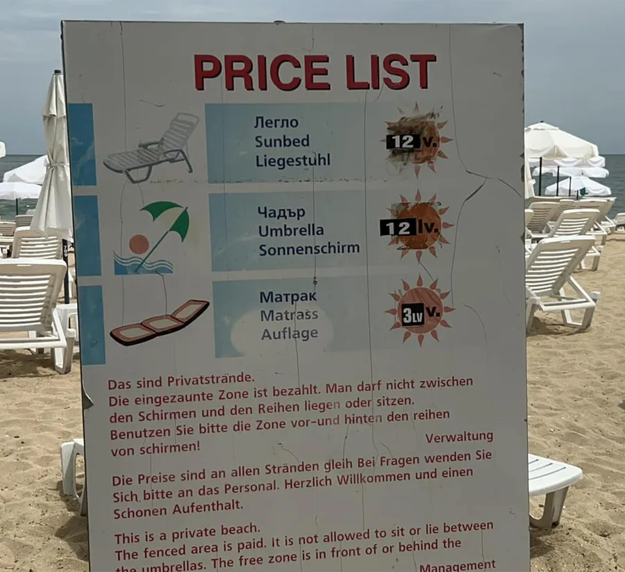 Zilele acestea, un turist român care se află în Bulgaria a postat imagini din Bulgaria, de la Nisipurile de Aur, pentru a arăta prețurile de acolo. Tarifele expuse sunt pentru zona centrală.
