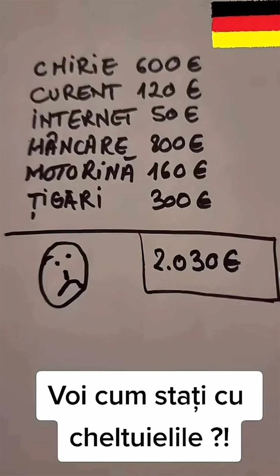 Românul și-a început lista cheltuielilor cu banii pe care îi dă pe chirie. Prețul unei locuințe modeste în Germania, dar echipată cu toate cele necesare, este unul de 600 de euro. Mai apoi, românul spune că 120 de euro mai scoate din buzunar doar pentru curent, la care se mai adaugă alți 50 de euro pe care îi plătește pentru abonamentul la internet.
