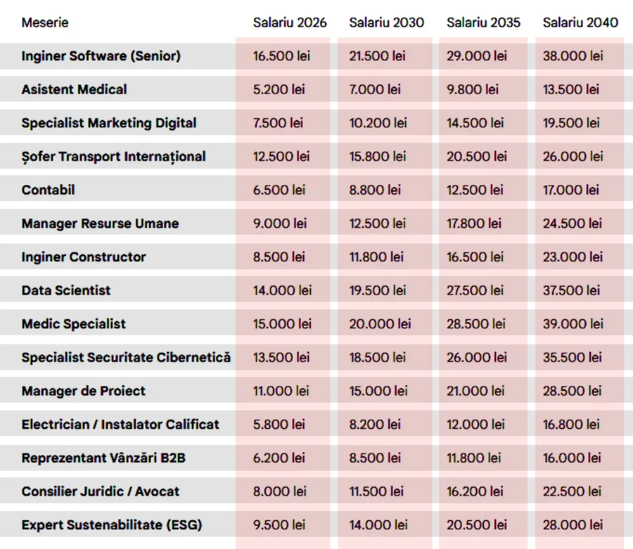Estimările arată că domenii precum IT-ul, medicina și data science vor rămâne printre cele mai bine plătite și în următoarele decenii. Un inginer software senior, un soecialist în IT sau un medic specialist ar putea ajunge până în 2040 la salarii lunare care se apropie de 40.000 de lei. Creșteri importante sunt prognozate și în domenii precum securitatea cibernetică, managementul de proiect sau marketingul digital, unde cererea de specialiști este în continuă creștere.