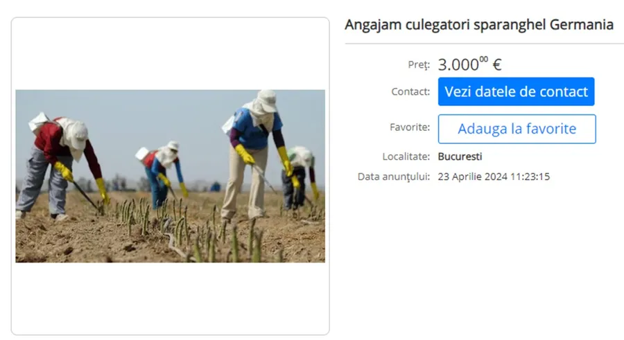 Ei bine, pe un site unde se publică adesea oferte de muncă, un anunț pentru culegători de sparanghel în Germania propune un salariu lunar de nici mai mult, nici mai puțin de 3.000 de euro. Salariul este unul uriaș, mai ales că, în urmă cu doar 2 ani, un astfel de loc de muncă era plătit cu un salariu de 1.600 – 1.800 de euro.