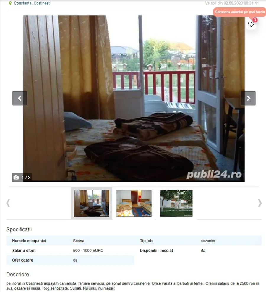 „Pe litoralul din Costinești, angajăm cameristă, femeie de serviciu, personal pentru curățenie. Orice vârstă, bărbați și femei. Oferim salariu de la 2.500 de RON în sus, cazare și masă”, se arată în anunț.