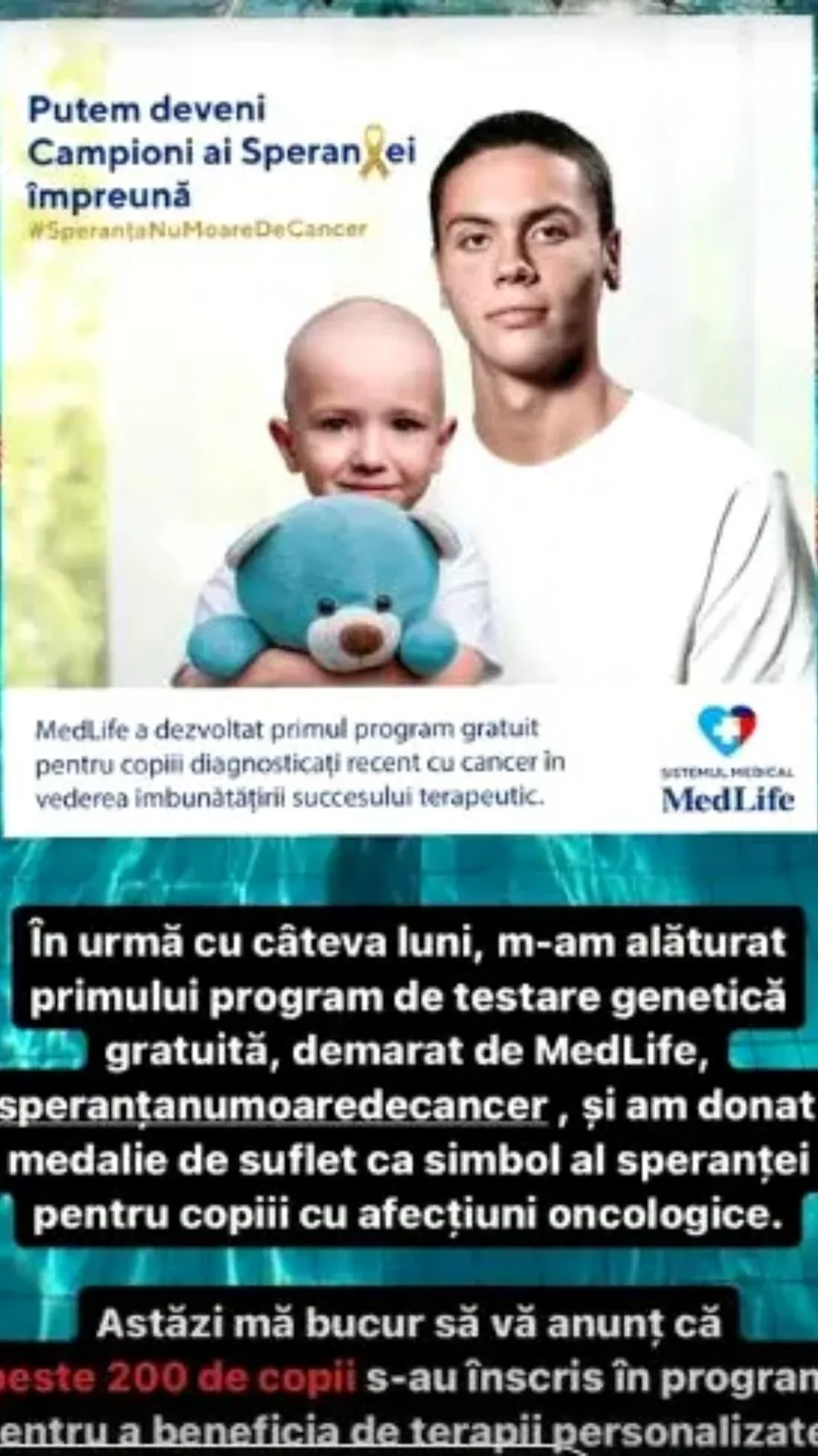 „În urmă cu câteva luni, m-am alăturat primului program de testare genetică gratuită și am donat o medalie de suflet ca simbol al speranței pentru copiii cu afecțiuni oncologice.