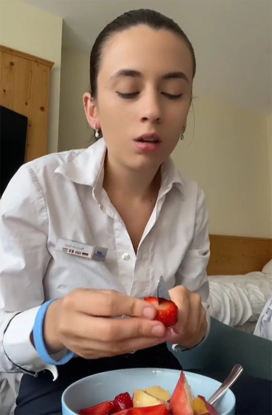 Așa sunt ei obișnuiți, dar sunt curioasă, voi, cei care stați în Germania, cum v-ați obișnuit cu mâncarea de aici? Sau cei din Austria, că e același lucru. Deci, bucătăria lor este praf. Din punctul meu de vedere, este praf. Acum am venit în cameră să îmi fac o salată de fructe. Din păcate, nu îmi pot face mâncare, că mi-aș face doar că nu am bucătărie aici, am doar camera în care stau pe perioada verii. Sunt nevoită să mănânc ce mănâncă și ei, dar eu nu mai rezist”, a povestit studenta, în mediul online.