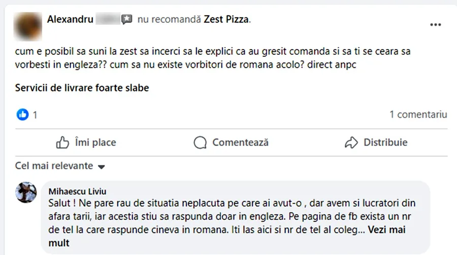 „Cum este posibil să suni la Zest să încerci să le explici că au greșit comanda și să ți se ceară să vorbești în engleză? Cum să nu existe vorbitori de română acolo? Direct ANPC”, este mesajul de nemulțumire transmis de Alexandru.