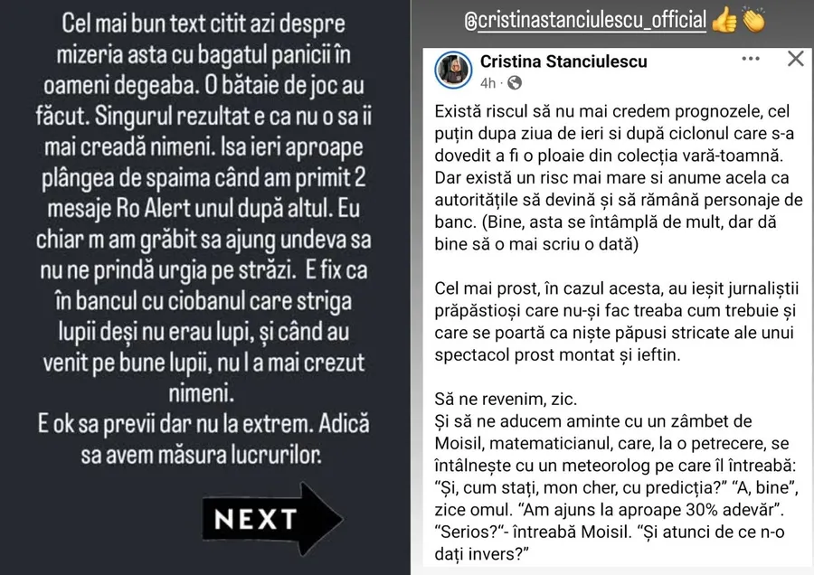 Oana Roman nu s-a oprit aici. Aceasta crede că nu este în regulă faptul că „s-a băgat panica” în populație, pentru că oamenii nu vor mai crede de acum înainte tot ce li se zice. Aceasta a punctat faptul că Isa s-a speriat teribil atunci când a primit 2 mesaje Ro-Alert, mai ales pentru că cele două se aflau în oraș. S-au grăbit să fugă din calea ciclonului ce urma să vină, dar n-a mai venit.